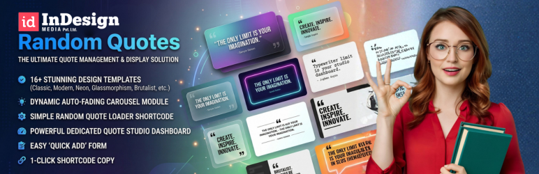 InDesign Random Quotes allows you to effortlessly display beautiful, engaging quotes anywhere on your site. Choose between a vast, curated “Universal” collection of 100 popular global quotes or easily build your own “Manual” custom list using the Quote Studio dashboard.